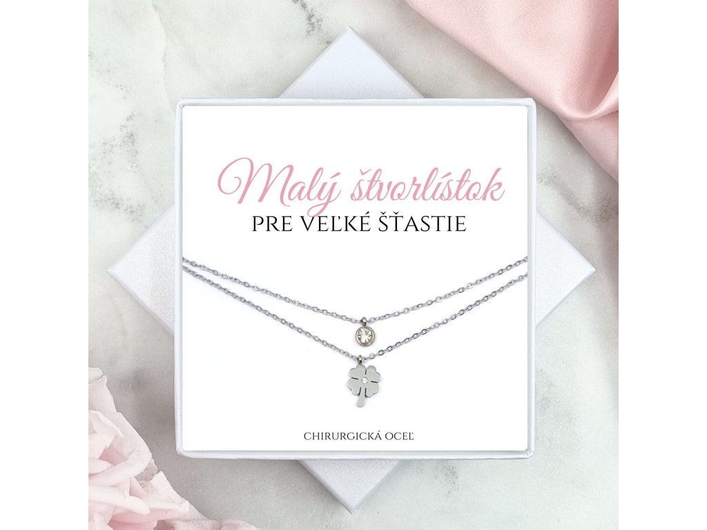 Krásny a jednoduchý náhrdelník, ktorý zaručene poteší svojím jemným a nadčasovým dizajnom. Na retiazke vyniká štvorlístok so zirkónom, symbol šťastia a ochrany, doplnený o ligotavý krištálik, ktorý dodáva šperku jemný lesk a eleganciu.