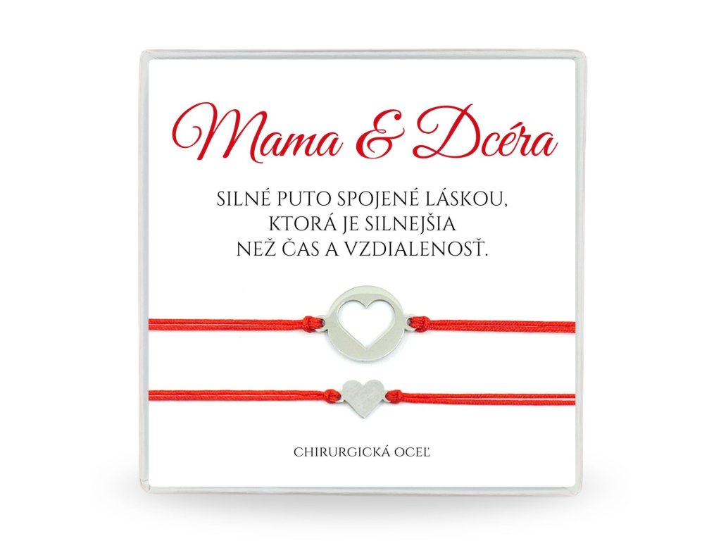 Jedno srdce, dve duše. Tento výnimočný set šnúrkových náramkov pre mamu a dcéru symbolizuje lásku a puto, ktoré nič nenahradí. Srdiečko z náramku dcéry presne zapadne do otvoru v prívesku na náramku pre mamu, čím spolu tvoria jeden celok – tak ako vy.