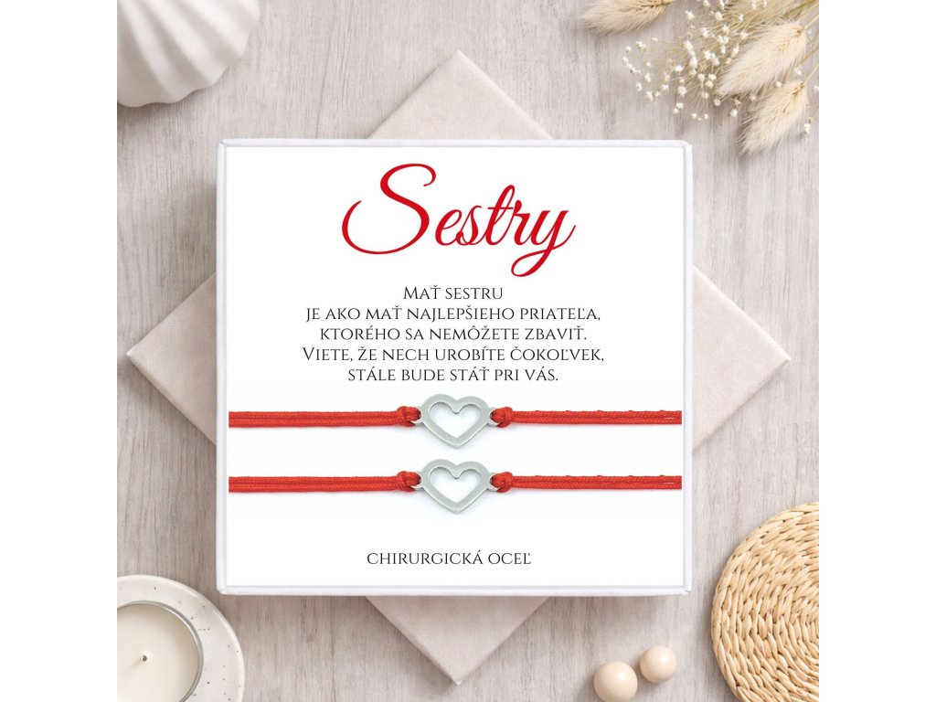 Sesterské puto, ktoré drží navždy. Set šnúrkových náramkov s príveskom srdiečko je krásnym symbolom lásky, blízkosti a výnimočného vzťahu medzi sestrami. Každý náramok pripomína, že aj keď nie ste vždy spolu, v srdci máte jedna druhú.