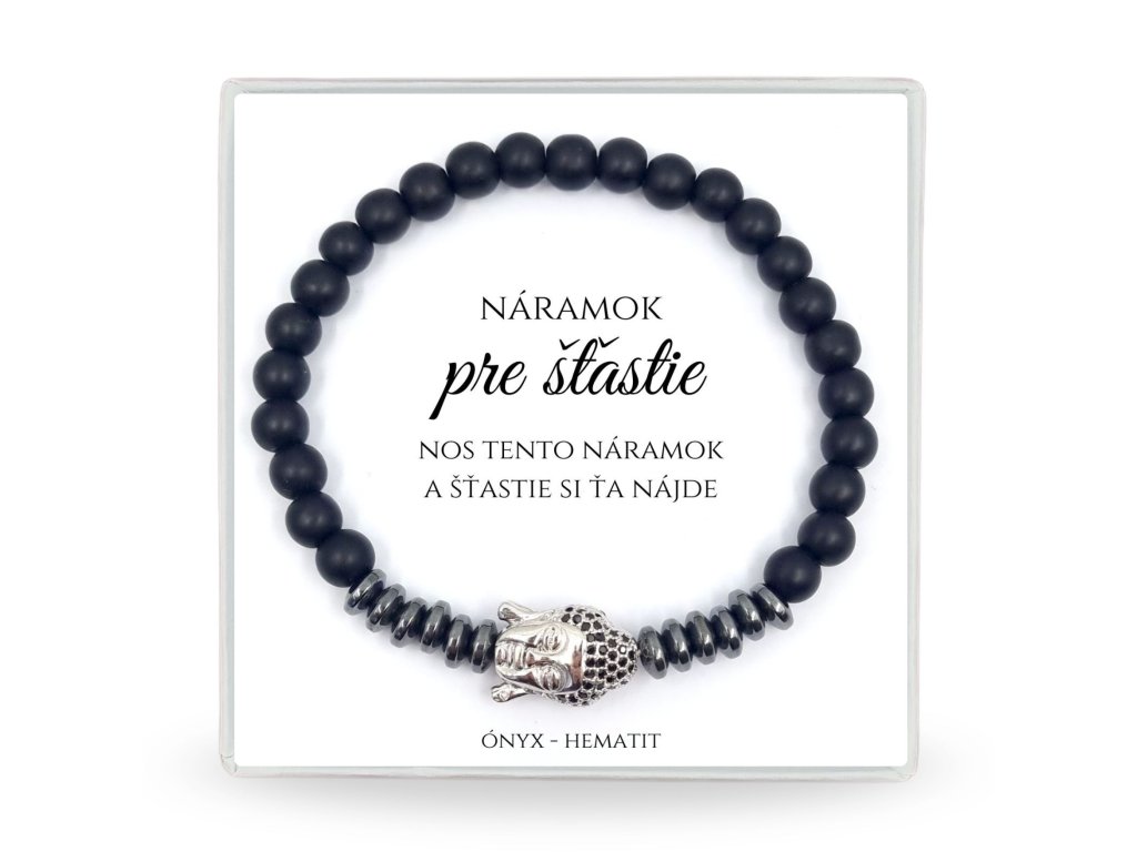 Elegantný pánsky náramok vyrobený z prírodných kameňov ónyxu a hematitu doplnený o symbolickú hlavu Buddhu, ktorá predstavuje pokoj, múdrosť a vnútornú rovnováhu.