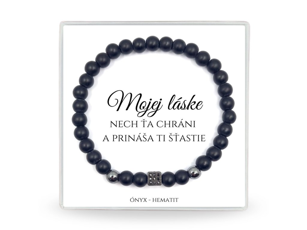 Elegantný pánsky náramok ručne vyrobený z prírodných kameňov ónyxu a hematitu. Kombinácia týchto minerálov symbolizuje silu, stabilitu a vnútorný pokoj, takže je ideálnym doplnkom pre moderného muža.