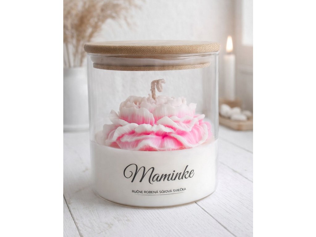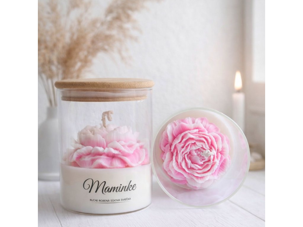 Doprajte si chvíľu pokoja s ručne odlievanou sójovou sviečkou v tvare elegantnej pivonky. Sviečka je zasadená do čistej sklenenej nádoby s prírodným bambusovým vrchnákom, ktorý podčiarkuje jej minimalistický a nadčasový vzhľad.