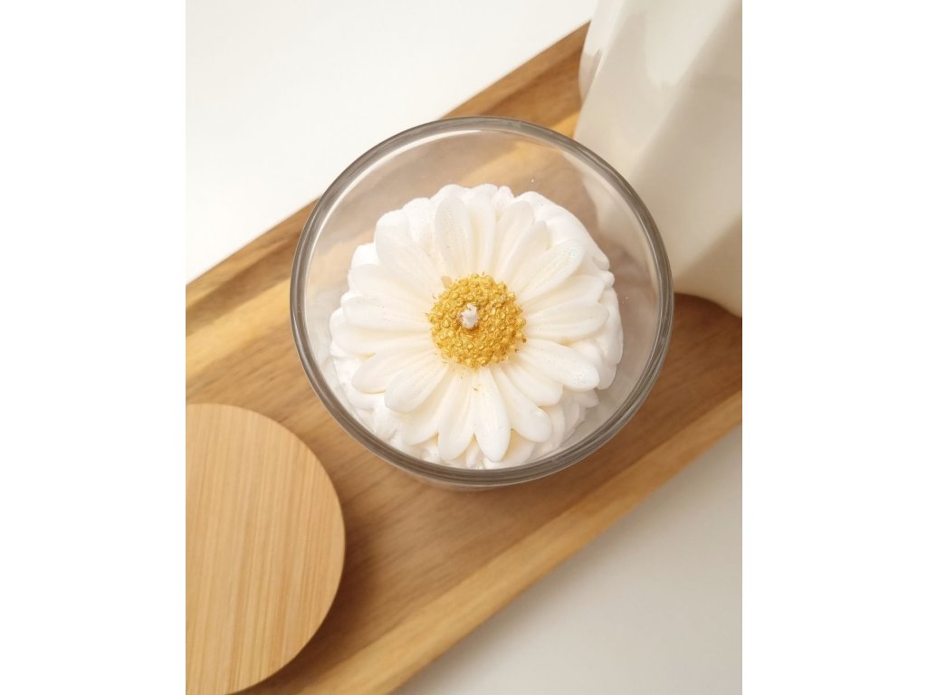 Dodajte svojmu domovu nádych nežnosti a vône s našou ručne robenou sójovou sviečkou v tvare margarétky, ukrytou v elegantnej sklenenej nádobe s bambusovým vrchnákom. Každá sviečka je starostlivo odlievaná z prírodného sójového vosku, vďaka čomu horí čisto, pomaly a rovnomerne.