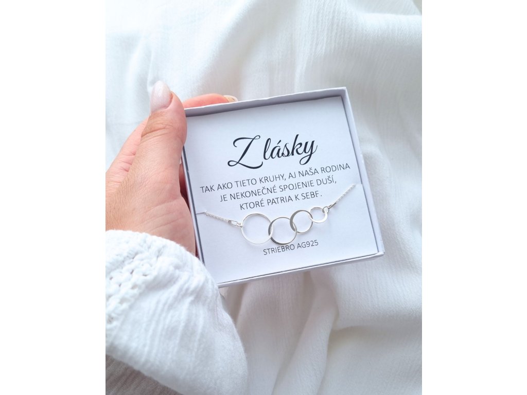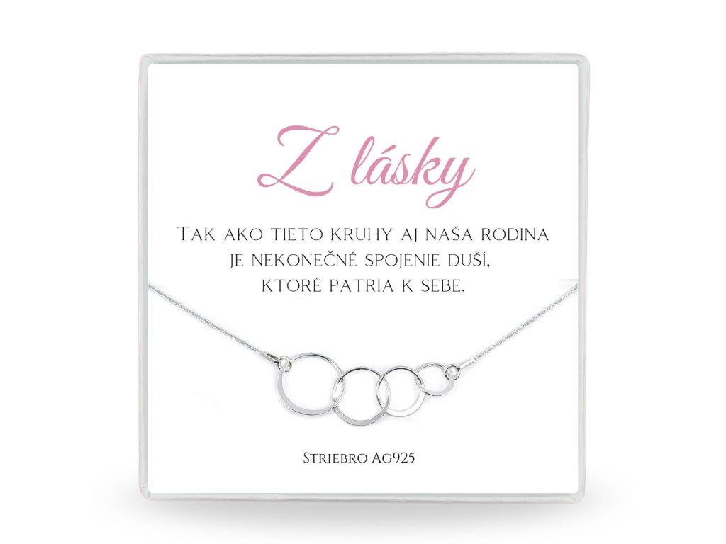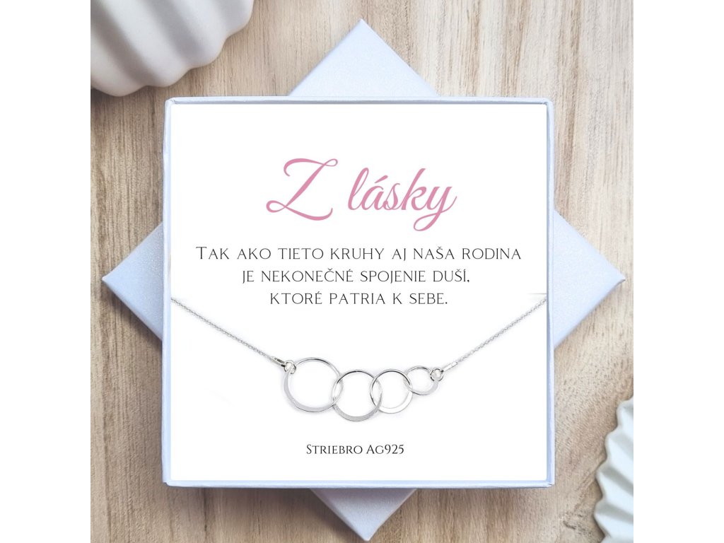 Strieborná retiazka so štyrmi prepojenými kruhmi v darčekovej krabičke s venovaním a citátom na želanie