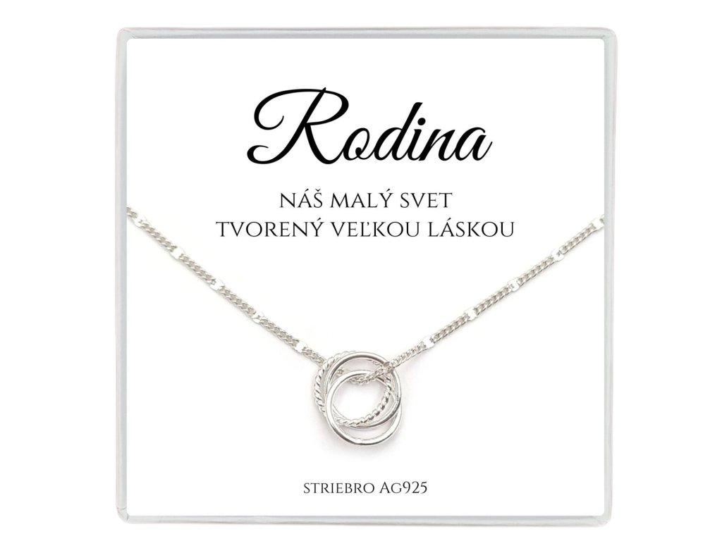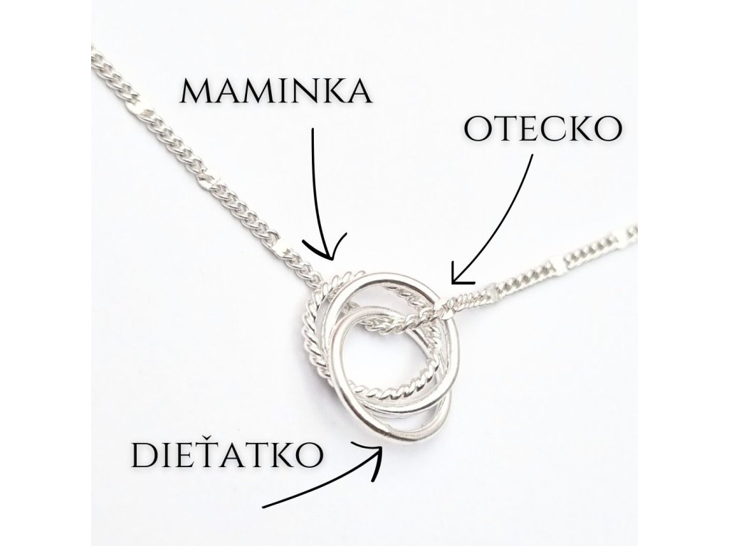 Krásna ligotavá strieborná retiazka s príveskom troch prepletených kruhov symbolizujúca pevné puto.