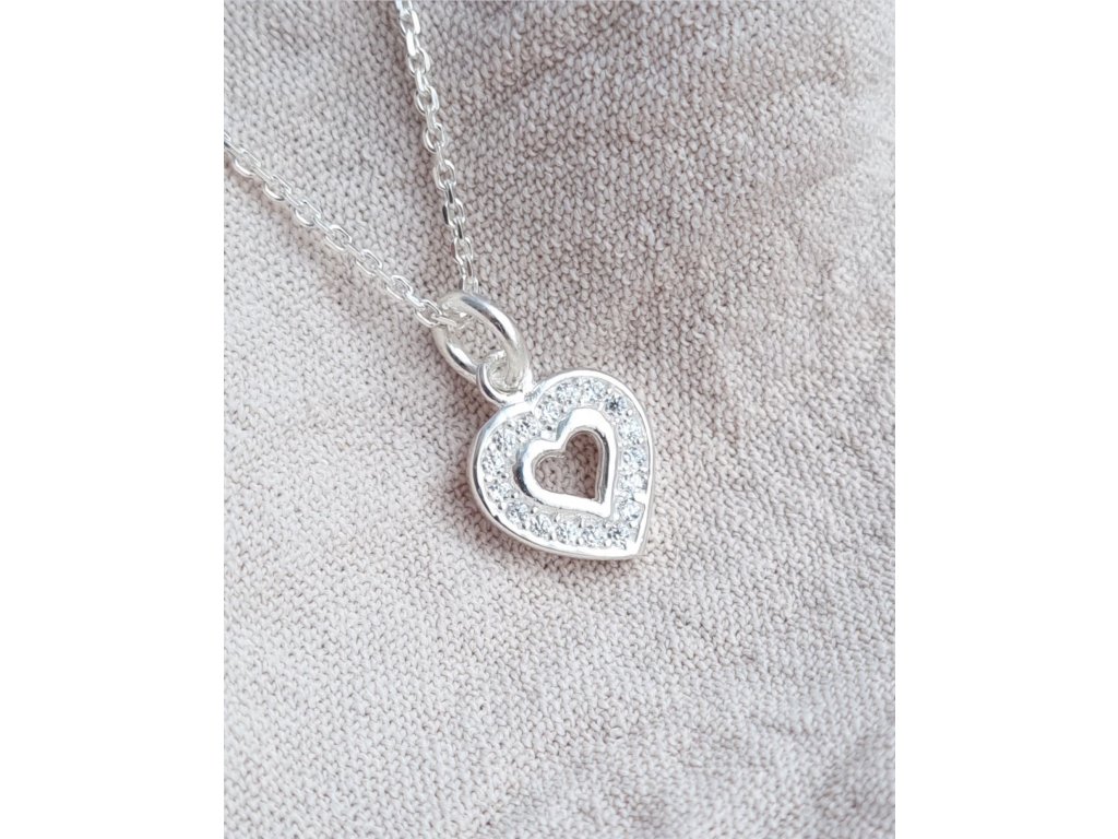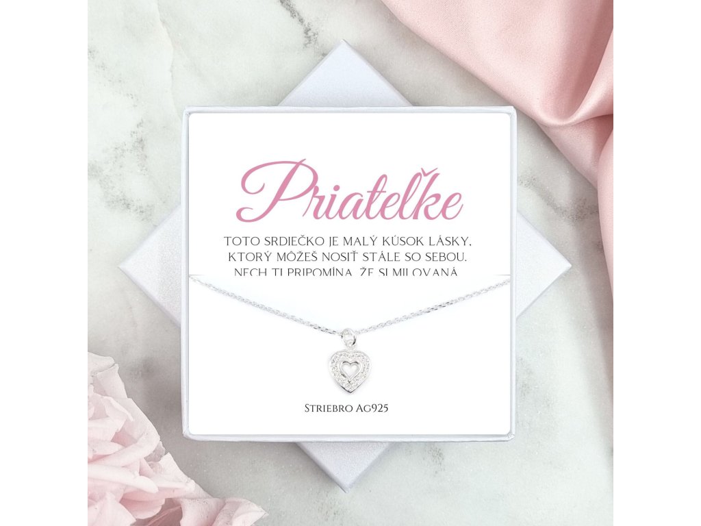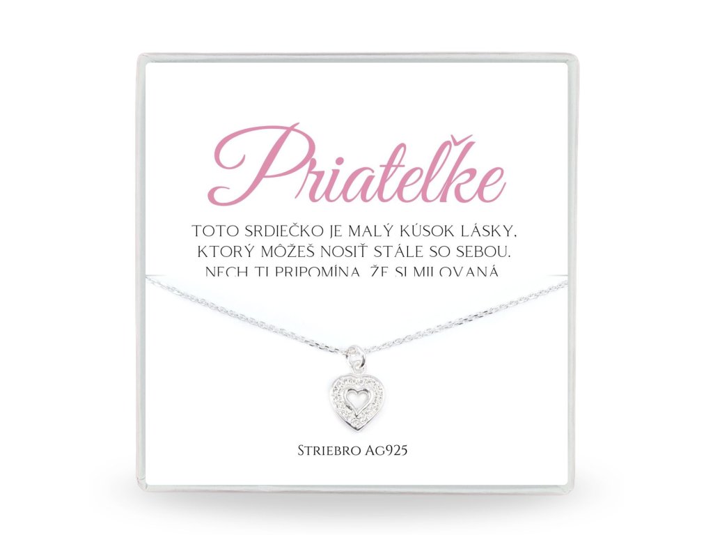 Strieborná retiazka s príveskom srdiečka s krištálikmi v darčekovej krabičke s venovaním a citátom na želanie