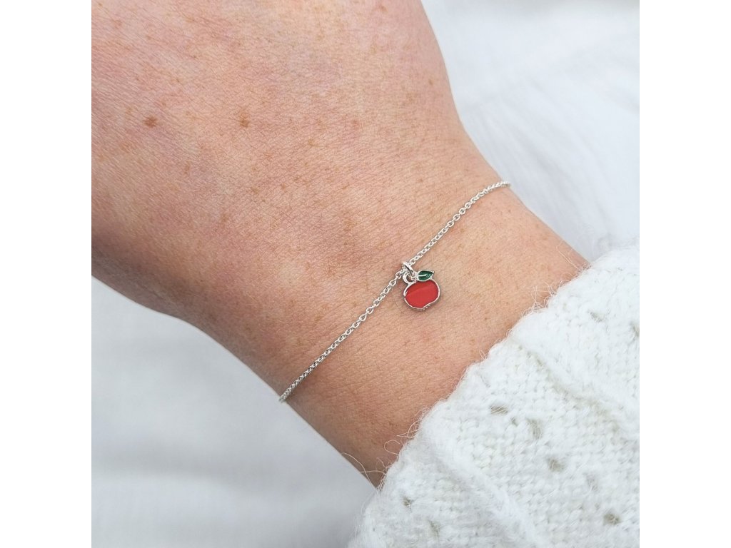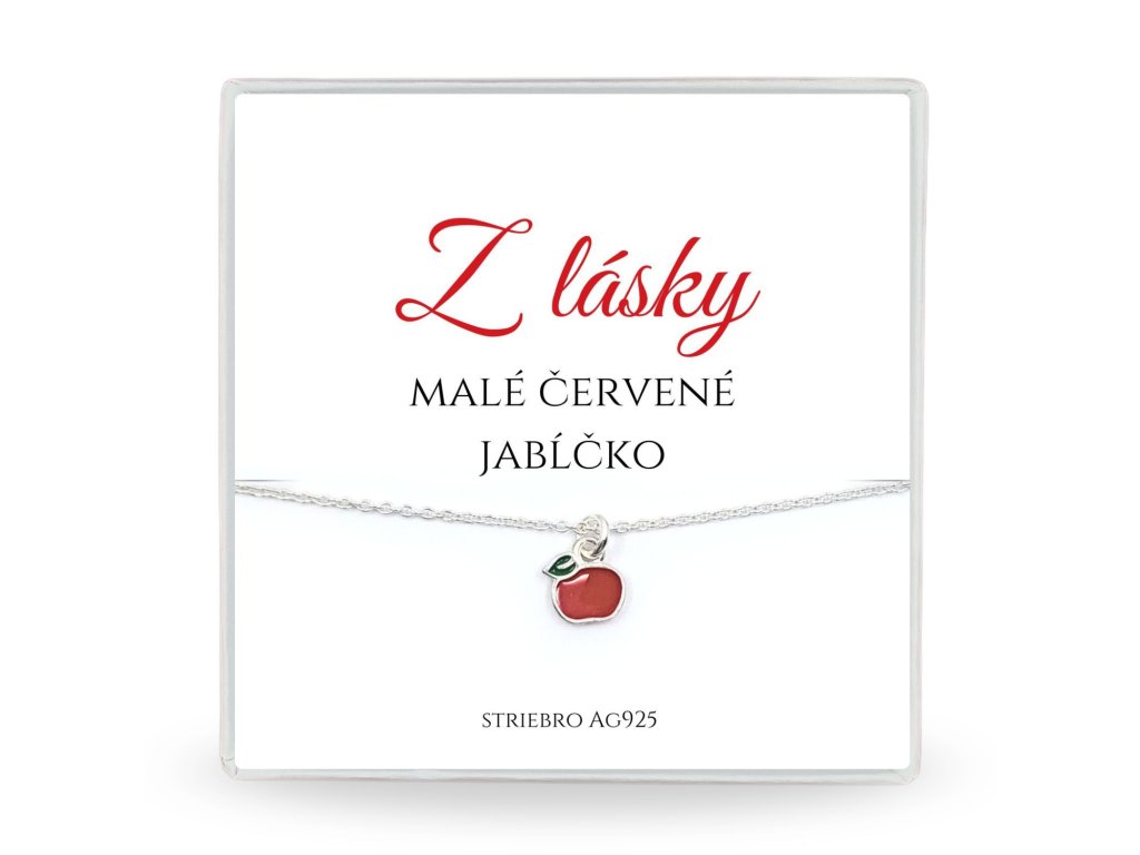 Jemný strieborný retiazkový náramok s príveskom v tvare červeného jabĺčka, symbolu zdravia, vitality, lásky a hojnosti. Vďaka svojmu nežnému dizajnu a výraznej farbe je krásnym doplnkom na každodenné nosenie aj milým talizmanom s pozitívnym významom.
